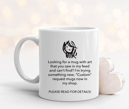 Custom mug art request. Please leave a note when checking out with the artwork you are looking for. *This is for existing artwork only*. Art is not customizable (meaning, I can't change hair color, etc). If I do not have the artwork available or it is artwork consigned to someone else, I will let you know and refund you.ย